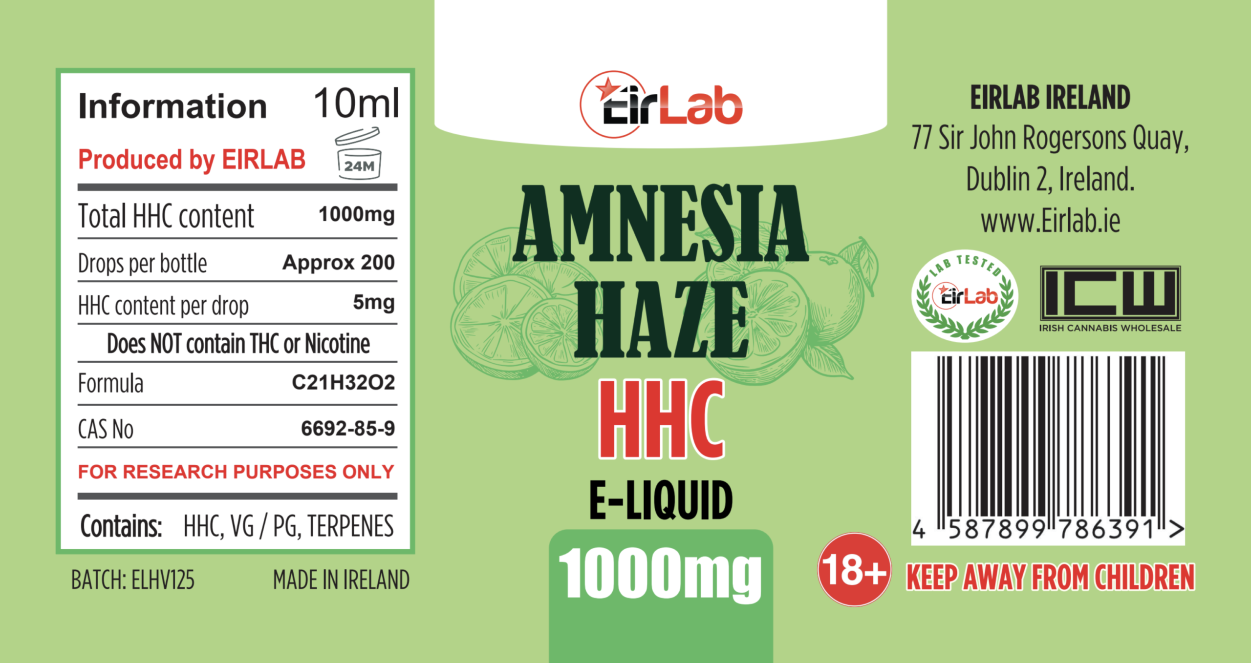 CLICK HERE to view the full analysis of terpenes contains in the EIRLAB Amnesia Haze HHC E-Liquid