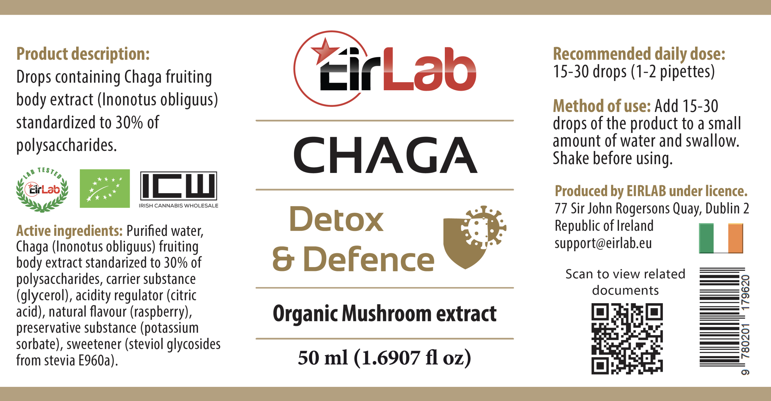 EIRLAB Chaga mushroom tincture is produced in Ireland using only organic ingredients. 100% Natural.